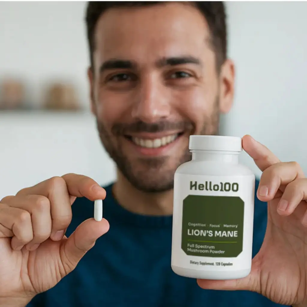 Hello100 Lion’s Mane uses a full-spectrum extraction of 100% organic fruiting body and mycelium, so you get both neuro-activating hericenones/erinacines and immune-boosting β-glucans (standardized to above 20%) in every vegan capsule.