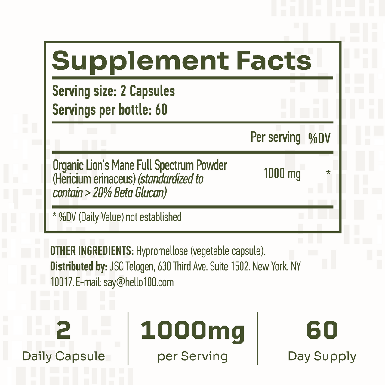 Hello100 Lion’s Mane Capsules are engineered with full-spectrum fruiting body & mycelium powder, synthesized from a natural Lion’s Mane mushroom in the primordial stage. Each capsule contains 500 mg of potent, concentrated Lion’s Mane powder (standardized to >20% beta glucans).